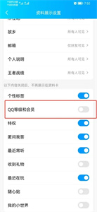5、在里面找到【QQ等级和会员】这个功能,把后面的蓝色按钮关闭;