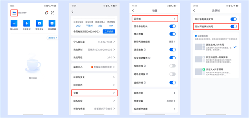 点击APP主界面「头像」->【设置】->【云录制】->勾选【同时开启录制转写】->在会中开启「云录制」即同时开启录制转写。